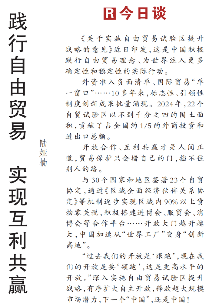 《关于实施自由贸易试验区提升战略的意见》近日印发,这是中国积极践行自由贸易理念、为世界注入更多确定性和稳定性的实际行动。(今日《人民日报》1版)