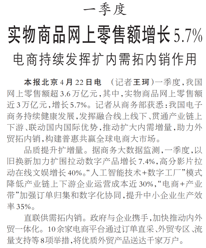一季度,我国网上零售额超3.6万亿元,其中,实物商品网上零售额近3万亿元,增长5.7%。记者从商务部获悉:我国电子商务持续健康发展,发挥融合线上线下、贯通产业链上下游、联动国内国际优势,推动扩大内需增量,助力外贸拓内销,构建普惠共赢全球电商大市场。(今日《人民日报》1版)