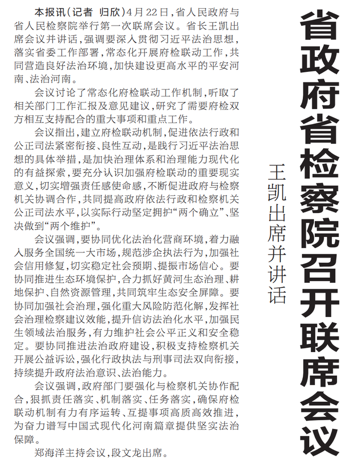 4月22日,省人民政府与省人民检察院举行第一次联席会议。省长王凯出席会议并讲话,强调要深入贯彻习近平法治思想,落实省委工作部署,常态化开展府检联动工作,共同营造良好法治环境,加快建设更高水平的平安河南、法治河南。(今日《河南日报》1版)