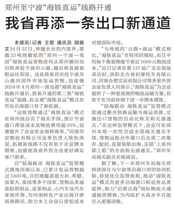 4月22日,伴随长长的汽笛声,搭载23吨热敏纸的“郑州—宁波—英国”海铁直运货物班列从郑州圃田站启程奔赴宁波舟山港,随后将直接装船运往英国。这是我省首次经宁波舟山港向国外市场发运货物,也是继2024年4月郑州—青岛港“海铁直运”线路开通后,我省开通的第二条“海铁直运”线路,标志着“海铁直运”模式在华东沿海港口有了新拓展。(今日《河南日报》1版)