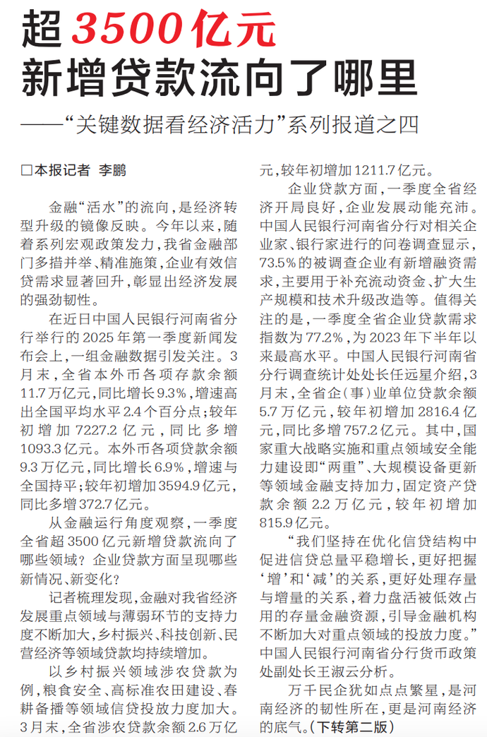 金融“活水”的流向,是经济转型升级的镜像反映。今年以来,随着系列宏观政策发力,我省金融部门多措并举、精准施策,企业有效信贷需求显著回升,彰显出经济发展的强劲韧性。(今日《河南日报》1版、2版)