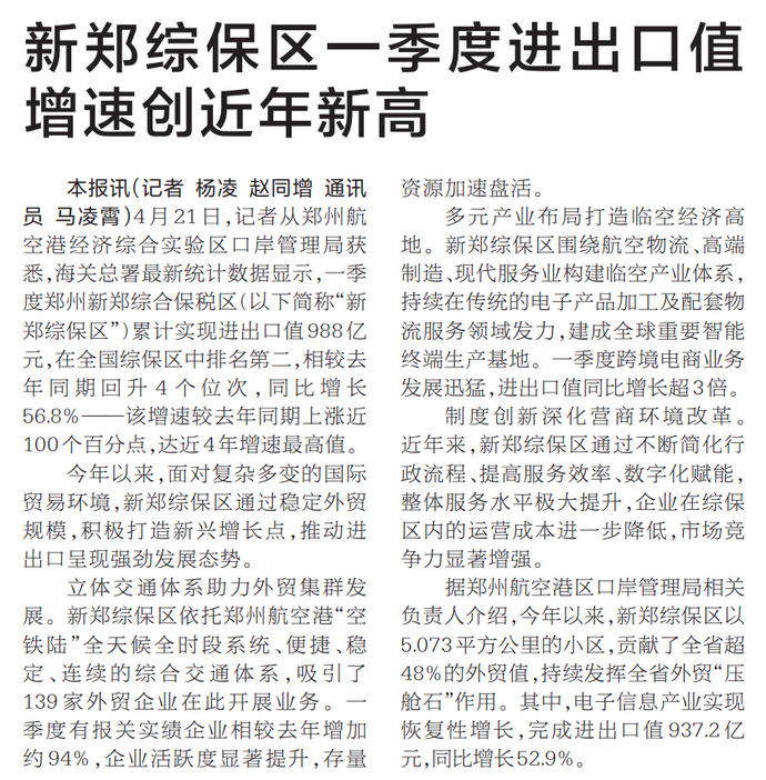 4月21日,记者从郑州航空港经济综合实验区口岸管理局获悉,海关总署最新统计数据显示,一季度郑州新郑综合保税区(以下简称“新郑综保区”)累计实现进出口值988亿元,在全国综保区中排名第二,相较去年同期回升4个位次,同比增长56.8%——该增速较去年同期上涨近100个百分点,达近4年增速最高值。(今日《河南日报》2版)