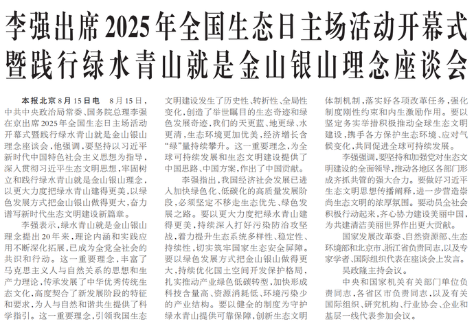 8月15日,中共中央政治局常委、国务院总理李强在京出席2025年全国生态日主场活动开幕式暨践行绿水青山就是金山银山理念座谈会,他强调,要坚持以习近平新时代中国特色社会主义思想为指导,深入贯彻习近平生态文明思想,牢固树立和践行绿水青山就是金山银山理念,以更大力度把绿水青山建得更美,以绿色发展方式把金山银山做得更大,奋力谱写新时代生态文明建设新篇章。(今日《人民日报》1版)