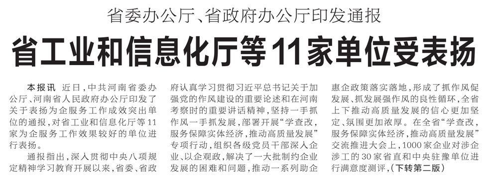 近日,中共河南省委办公厅、河南省人民政府办公厅印发了关于表扬为企服务工作成效突出单位的通报,对省工业和信息化厅等11家为企服务工作效果较好的单位进行表扬。(今日《河南日报》1版、2版)
