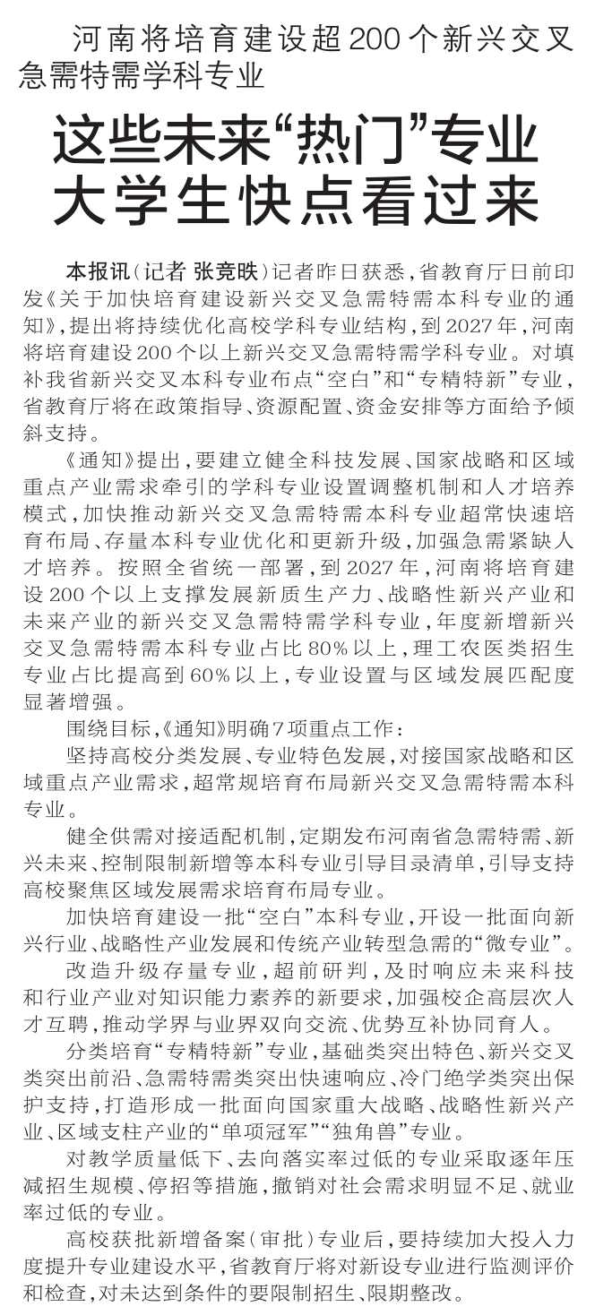 记者昨日获悉,省教育厅日前印发《关于加快培育建设新兴交叉急需特需本科专业的通知》,提出将持续优化高校学科专业结构,到2027年,河南将培育建设200个以上新兴交叉急需特需学科专业。对填补我省新兴交叉本科专业布点“空白”和“专精特新”专业,省教育厅将在政策指导、资源配置、资金安排等方面给予倾斜支持。(今日《郑州日报》1版)