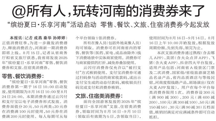 正值消费旺季,为进一步激发消费潜力、释放消费活力,河南新一期消费券即将上线。8月15日,记者从省商务厅和省文旅厅获悉,我省将发放2025年“缤纷夏日·乐享河南”零售、餐饮消费券和文旅、住宿类消费券。(今日《郑州日报》1版)