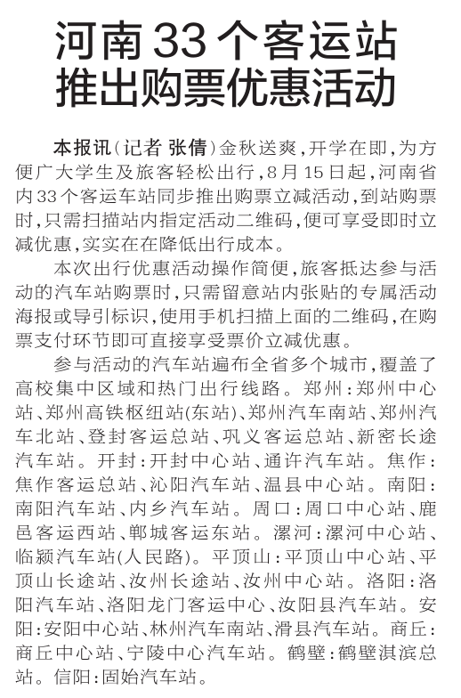 金秋送爽,开学在即,为方便广大学生及旅客轻松出行,8月15日起,河南省内33个客运车站同步推出购票立减活动,到站购票时,只需扫描站内指定活动二维码,便可享受即时立减优惠,实实在在降低出行成本。(今日《郑州日报》2版)