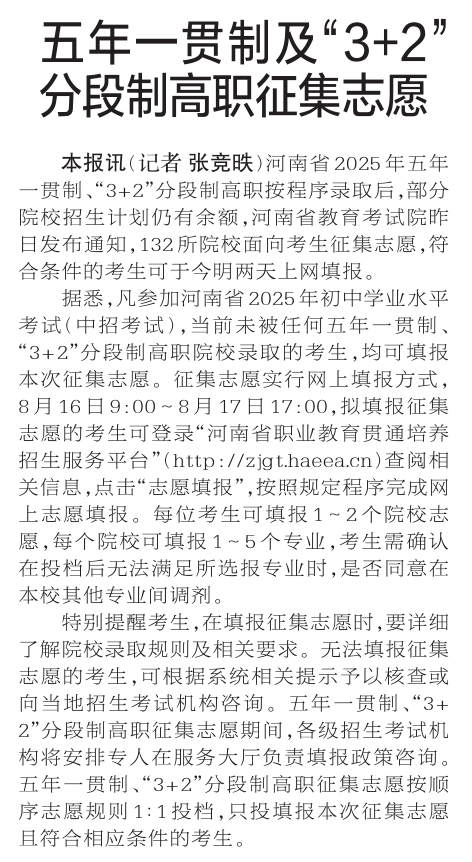 河南省2025年五年一贯制、“3+2”分段制高职按程序录取后,部分院校招生计划仍有余额,河南省教育考试院昨日发布通知,132所院校面向考生征集志愿,符合条件的考生可于今明两天上网填报。(今日《郑州日报》2版)