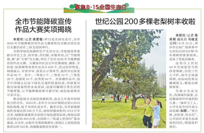 昨日是全国生态日,全市2025年节能降碳宣传作品大赛颁奖仪式暨全国生态日主题活动在二砂文创园举行。(今日《郑州日报》2版)
