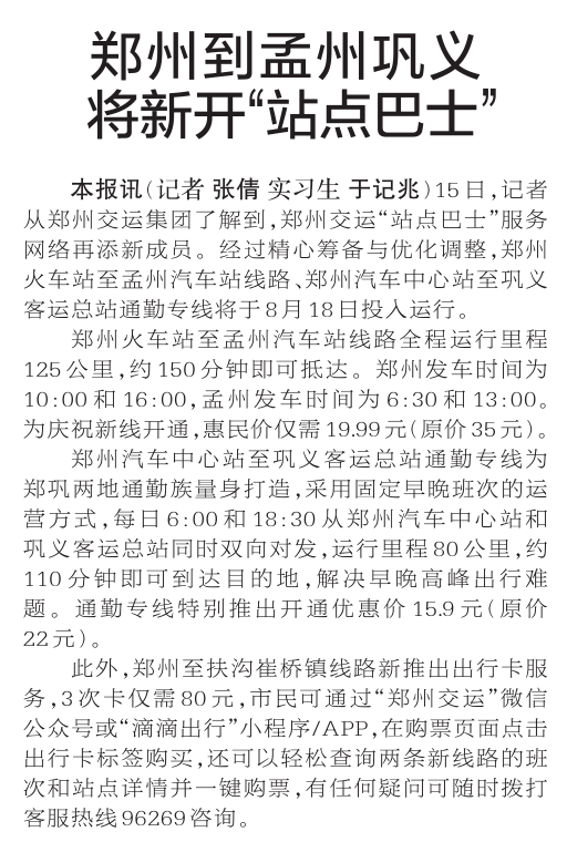 15日,记者从郑州交运集团了解到,郑州交运“站点巴士”服务网络再添新成员。经过精心筹备与优化调整,郑州火车站至孟州汽车站线路、郑州汽车中心站至巩义客运总站通勤专线将于8月18日投入运行。(今日《郑州日报》2版)