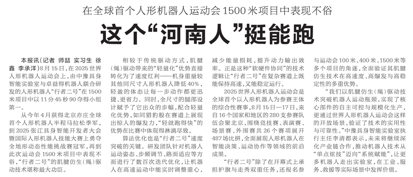 8月15日,在2025世界人形机器人运动会上,由中豫具身智能实验室与卓益得机器人联合研发的人形机器人“行者二号”在1500米项目中以11分45秒90夺得小组第一。(今日《河南日报》1版)