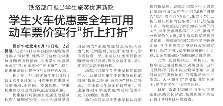 记者15日从中国国家铁路集团有限公司获悉,铁路部门将优化学生旅客购票出行措施,推出学生优惠票全年可用、动车票价“折上折”。相关优惠车票预计将于9月6日开始发售。(今日《郑州日报》1版)