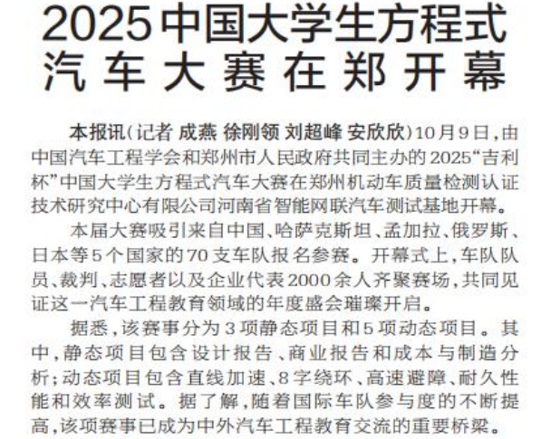 10月9日,由中国汽车工程学会和郑州市人民政府共同主办的2025“吉利杯”中国大学生方程式汽车大赛在郑州机动车质量检测认证技术研究中心有限公司河南省智能网联汽车测试基地开幕。(今日《郑州日报》1版)