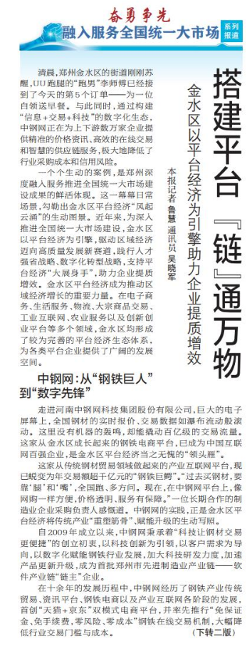 清晨,郑州金水区的街道刚刚苏醒,UU跑腿的“跑男”李师傅已经接到了今天的第5个订单——为一位白领送早餐。与此同时,通过构建“信息+交易+科技”的数字化生态,中钢网正在为上下游数万家企业提供精准的价格资讯、高效的在线交易和智慧的供应链服务,极大地降低了行业采购成本和信用风险。(今日《郑州日报》1版、2版)
