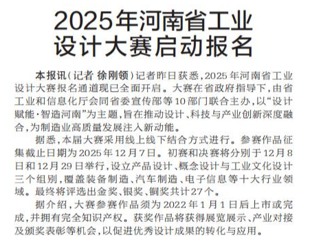 记者昨日获悉,2025年河南省工业设计大赛报名通道现已全面开启。大赛在省政府指导下,由省工业和信息化厅会同省委宣传部等10部门联合主办,以“设计赋能·智造河南”为主题,旨在推动设计、科技与产业创新深度融合,为制造业高质量发展注入新动能。(今日《郑州日报》2版)