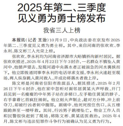 10月9日,中央政法委在京发布2025年第二、三季度见义勇为勇士榜。其中,来自河南的张欢欢、李永利、陈文彬三人光荣上榜。(今日《郑州日报》2版)