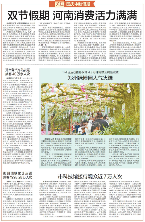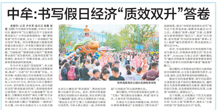 在二七塔下与国旗同框合影后,你是否还去郑州商代都城遗址博物院见证了四大方鼎“历史性团聚”?逛“郑州八‘景’”之余,你有没有在工业风满满的特色街区解锁“文旅+消费”新体验?这个双节,在郑州,特色文旅的独特魅力、特色消费的新鲜场景,让“假日经济”既有文化厚度,又有消费热度,绘就了一幅“特”具活力的商都盛景。(今日《郑州日报》1版、2版)