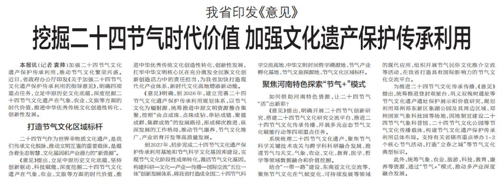 加强二十四节气文化遗产保护传承利用,推动节气文化繁荣兴盛。近日,省政府办公厅印发《关于加强二十四节气文化遗产保护传承利用的指导意见》,明确四项重点任务,立足中原历史文化底蕴,深度挖掘二十四节气文化遗产在气象、农业、文旅等方面的时代价值,推进中华优秀传统文化创造性转化、创新性发展。(今日《郑州日报》6版)