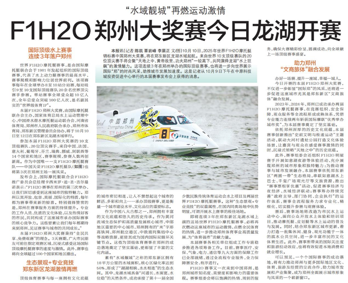 10月10日,2025年世界F1H2O摩托艇锦标赛中国郑州大奖赛,将在郑东新区龙湖水域起航。来自世界10支顶级赛队的20位顶尖赛手将会聚“天地之中、黄帝故里、功夫郑州”一较高下,共同演绎龙湖“水上狂飙”的激情魅力。这项连续3年在郑州举办的国际顶级赛事,也将进一步向世界展示国际“郑”的时尚风采,助推城市发展加速度。这是记者从10月9日下午在中原科技城投资促进中心举行的本届赛事发布会上获得的消息。(今日《郑州日报》8版)