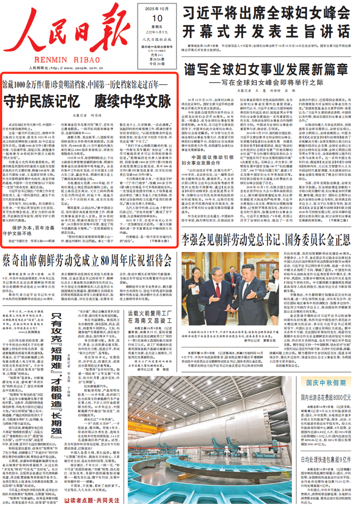 这是一座守护民族记忆、赓续中华文脉的文化宝库,前身为1925年10月成立的故宫博物院文献部,如今已走过百年历程。馆藏1000余万件(册)明清档案,与殷墟甲骨、居延汉简、敦煌遗书一起被誉为20世纪初中国古文献的“四大发现”。(今日《人民日报》1版、7版)