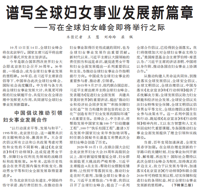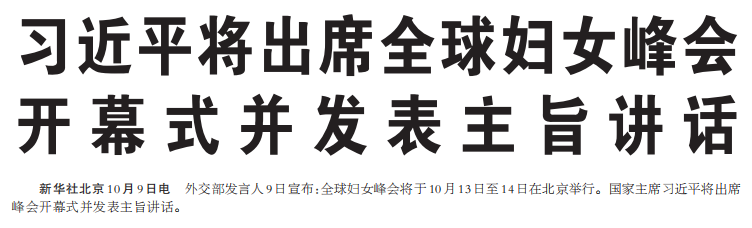 10月13日至14日,全球妇女峰会将在北京举行。国家主席习近平将出席峰会开幕式并发表主旨讲话。(今日《人民日报》1版、2版)