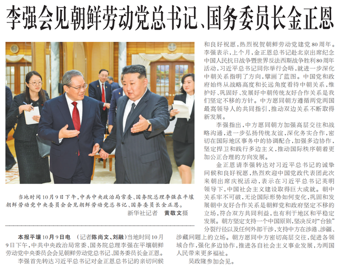 当地时间10月9日下午,中共中央政治局常委、国务院总理李强在平壤朝鲜劳动党中央委员会会见朝鲜劳动党总书记、国务委员长金正恩。(今日《人民日报》1版)