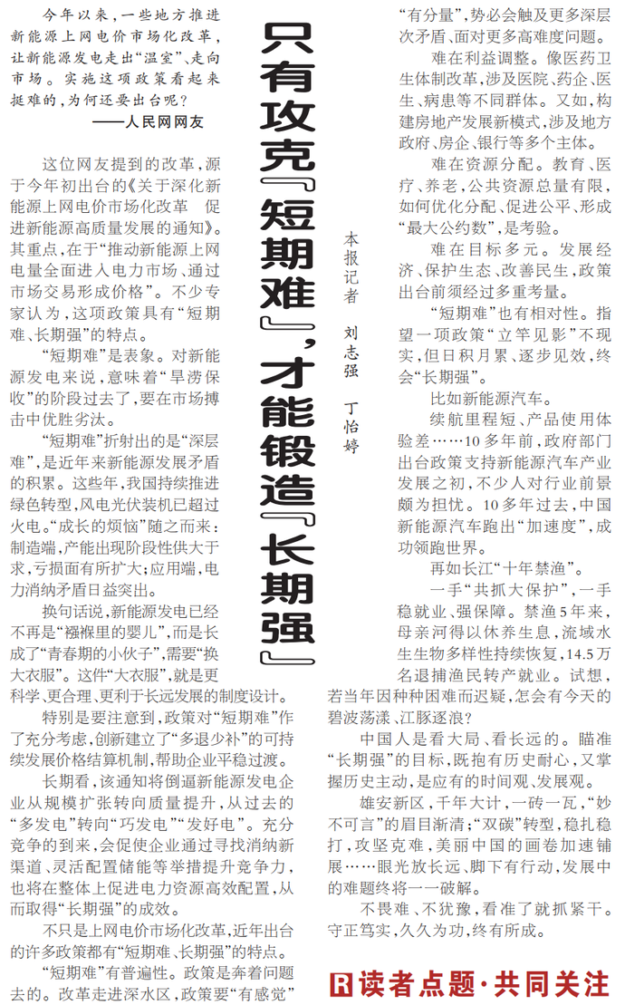 这位网友提到的改革,源于今年初出台的《关于深化新能源上网电价市场化改革 促进新能源高质量发展的通知》。其重点,在于“推动新能源上网电量全面进入电力市场、通过市场交易形成价格”。不少专家认为,这项政策具有“短期难、长期强”的特点。(今日《人民日报》1版)