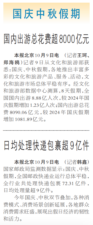 记者9日从文化和旅游部获悉:国庆、中秋假期,各地推出丰富多彩的文化和旅游产品、服务、活动,文化和旅游市场总体平稳有序。经文化和旅游部数据中心测算,8天假期,全国国内出游8.88亿人次,较2024年国庆假期增加1.23亿人次;国内出游总花费8090.06亿元,较2024年国庆假期增加1081.89亿元。(今日《人民日报》1版)
