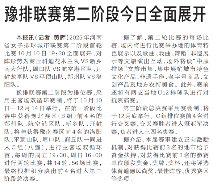 2025年河南省女子排球城市联赛第二阶段首轮比赛10月10日19:30全面展开,对阵形势为商丘科迪花木兰队VS新乡南太行队,周口队VS航空港区队,开封龙亭队VS平顶山队,郑州队VS洛阳队。(今日《河南日报》1版)
