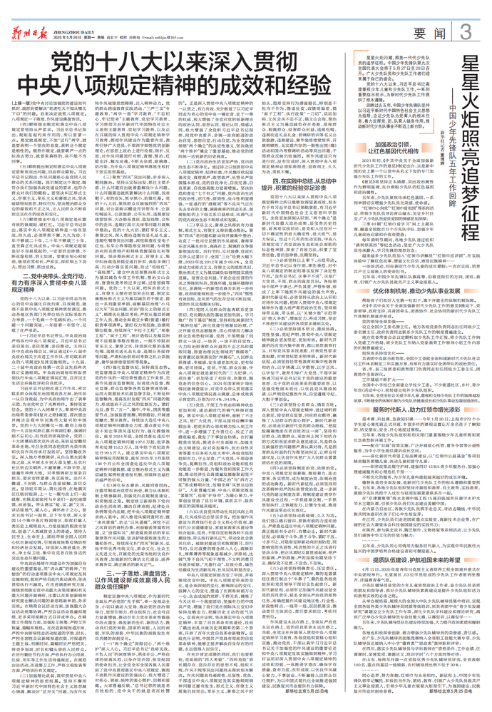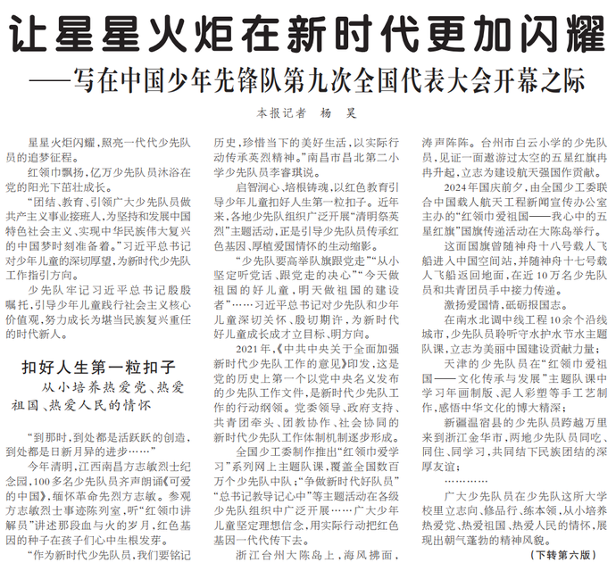红领巾飘扬,亿万少先队员沐浴在党的阳光下茁壮成长。(今日《人民日报》1版、6版)
