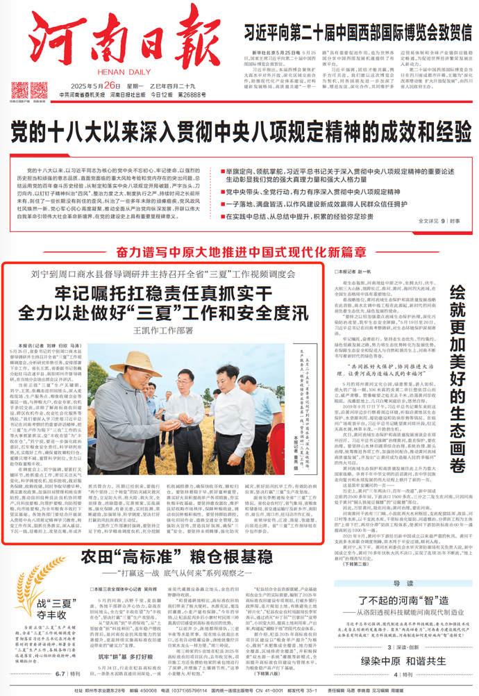 5月25日,省委书记刘宁到周口商水县督导调研并主持召开全省“三夏”工作视频调度会,分析研究形势任务,安排部署下步工作。省长王凯、省委副书记张巍分赴驻马店遂平县、南阳邓州市督导调研,在当地分会场出席会议并讲话。(今日《河南日报》1版)