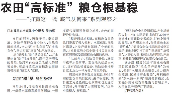 5月的河南,沃野千里,麦浪翻滚。各地干部群众齐心协力,奋战在田间地头,全力变“丰收在望”为“丰收在仓”,坚决打赢“三夏”生产攻坚战。(今日《河南日报》1版、8版)