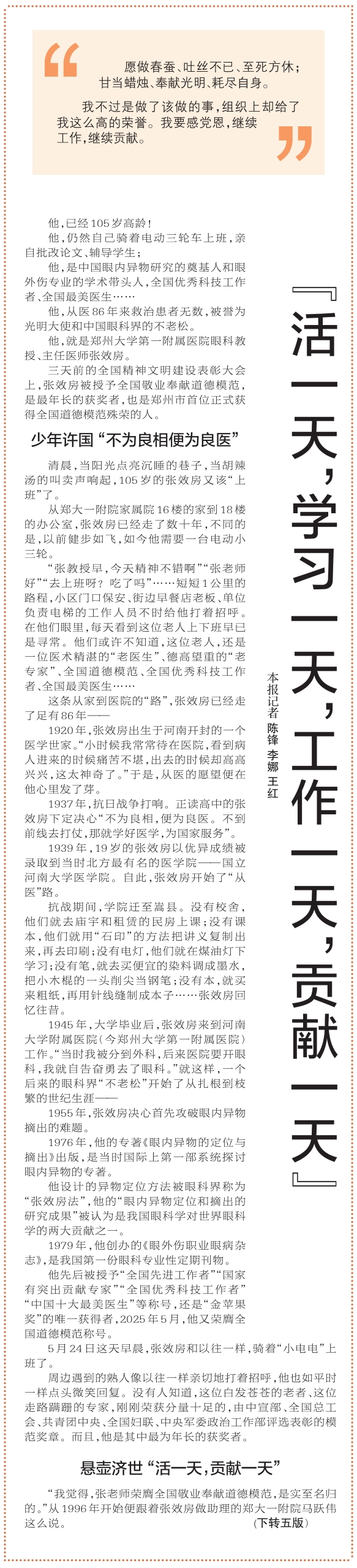 他,就是郑州大学第一附属医院眼科教授、主任医师张效房。(今日《郑州日报》1版、2版)