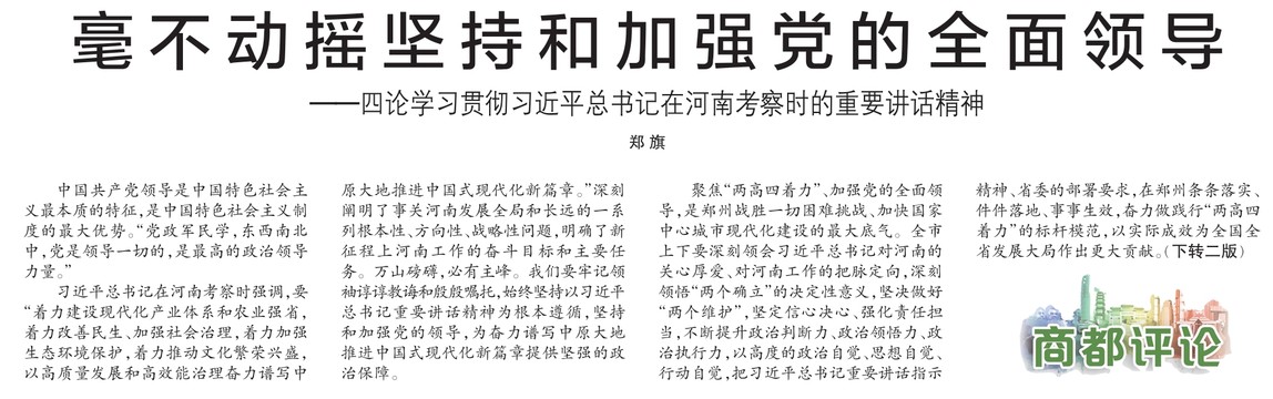 中国共产党领导是中国特色社会主义最本质的特征,是中国特色社会主义制度的最大优势。“党政军民学,东西南北中,党是领导一切的,是最高的政治领导力量。”(今日《郑州日报》1版、2版)