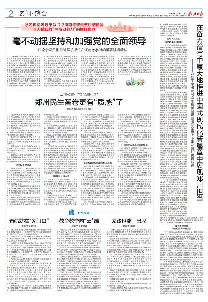 习近平总书记在河南考察时提出的“两高四着力”重要指示要求,为郑州高质量发展指明了方向。郑州市各级各部门迅速行动,将学习贯彻总书记重要讲话精神与实际工作紧密结合,聚焦产业升级、民生保障、社会治理等关键领域,以务实举措推动总书记河南考察重要讲话精神落地见效,在奋力谱写中原大地推进中国式现代化新篇章中展现郑州担当。(今日《郑州日报》1版、2版)