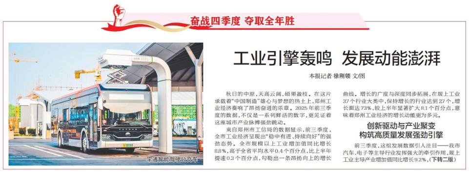 秋日的中原,天高云阔,硕果盈枝。在这片承载着“中国制造”雄心与梦想的热土上,郑州工业经济奏响了昂扬奋进的乐章。2025年前三季度的数据,不仅是一系列鲜活的数字,更见证着这座城市产业脉搏强劲跳动。(今日《郑州日报》1版、2版)
