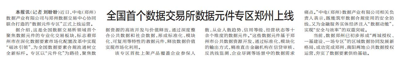 全国首个数据交易所数据元件专区郑州上线