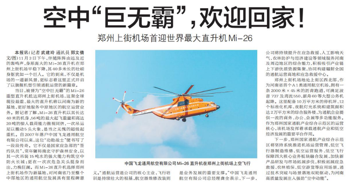 郑州上街机场首迎世界最大直升机Mi-26