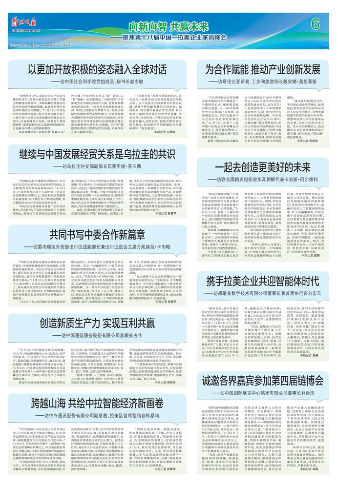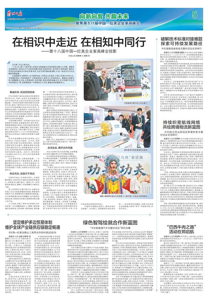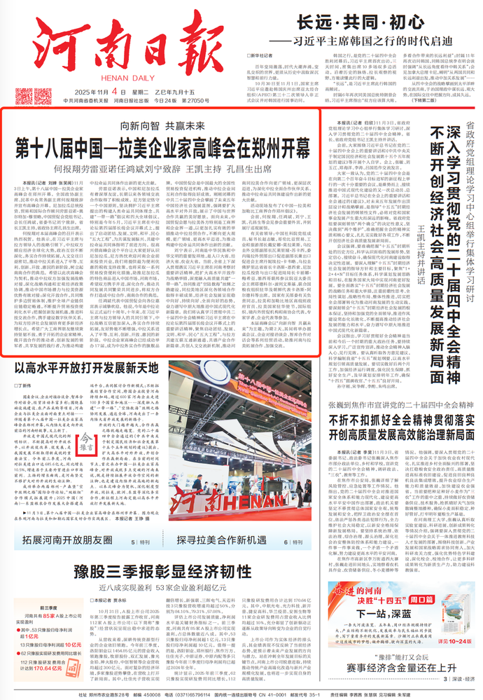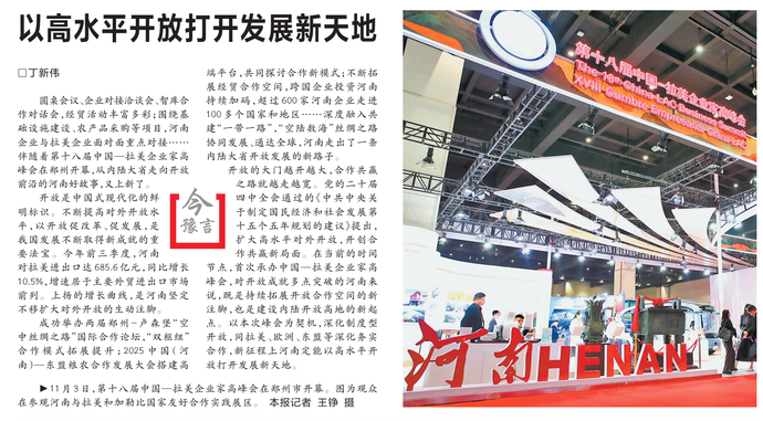 圆桌会议、企业对接洽谈会、智库合作对话会,经贸活动丰富多彩;围绕基础设施建设、农产品采购等项目,河南企业与拉美企业面对面重点对接……伴随着第十八届中国—拉美企业家高峰会在郑州开幕,从内陆大省走向开放前沿的河南好故事,又上新了。(今日《河南日报》1版)