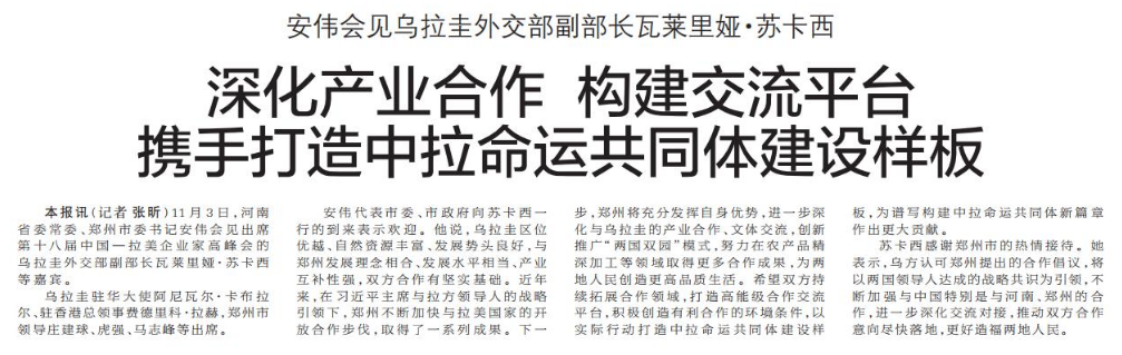 11月3日,河南省委常委、郑州市委书记安伟会见出席第十八届中国—拉美企业家高峰会的乌拉圭外交部副部长瓦莱里娅·苏卡西等嘉宾。