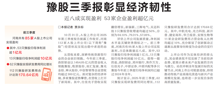 10月31日,A股上市公司2025年第三季度报告披露工作收官,河南112家A股上市公司(以下简称“豫股”)经营状况呈现出稳中求进的态势。(今日《河南日报》1版)