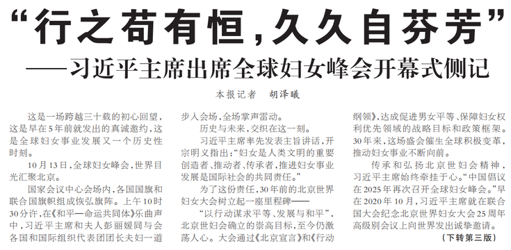 这是一场跨越三十载的初心回望,这是早在5年前就发出的真诚邀约,这是全球妇女事业发展又一个历史性时刻。(今日《人民日报》1版、3版)