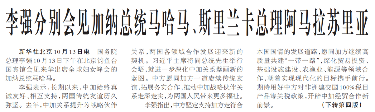 国务院总理李强10月13日下午在北京钓鱼台国宾馆会见来华出席全球妇女峰会的加纳总统马哈马。(今日《人民日报》1版、4版)