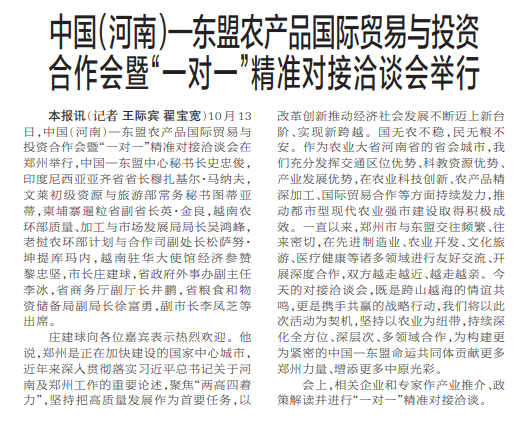 中国(河南)—东盟农产品国际贸易与投资合作会暨“一对一”精准对接洽谈会举行