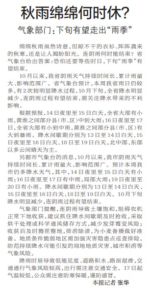 绵绵秋雨虽然诗意,但晾不干的衣衫、阵阵袭来的秋寒,还是让人渴盼阳光。连阴雨何时能结束?省气象台给出答案:恐怕还要等些时日,下旬“雨季”有望结束。(今日《郑州日报》2版)