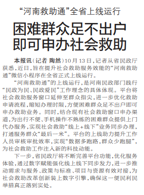 10月13日,记者从省民政厅获悉,近日,旨在提升社会救助服务效能的“河南救助通”微信小程序在全省正式上线运行。(今日《郑州日报》2版)