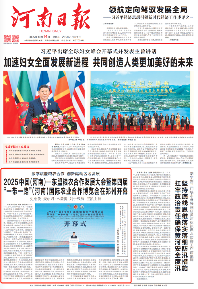 10月13日上午,2025中国(河南)—东盟粮农合作发展大会暨第四届“一带一路”(河南)国际农业合作博览会在郑州开幕。中国—东盟中心秘书长史忠俊、农业农村部副部长麦尔丹·木盖提、省委书记刘宁致辞。省长王凯主持。(今日《河南日报》1版)