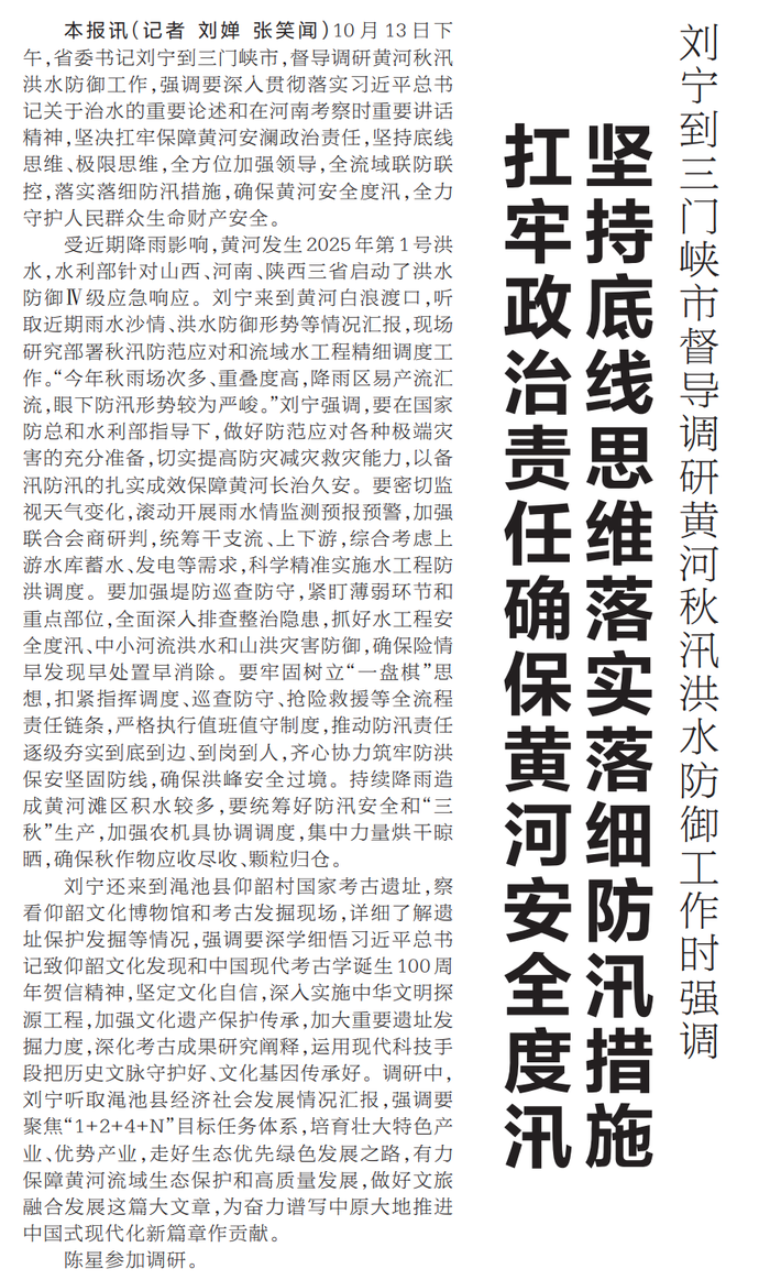 10月13日下午,省委书记刘宁到三门峡市,督导调研黄河秋汛洪水防御工作,强调要深入贯彻落实习近平总书记关于治水的重要论述和在河南考察时重要讲话精神,坚决扛牢保障黄河安澜政治责任,坚持底线思维、极限思维,全方位加强领导,全流域联防联控,落实落细防汛措施,确保黄河安全度汛,全力守护人民群众生命财产安全。(今日《河南日报》1版)