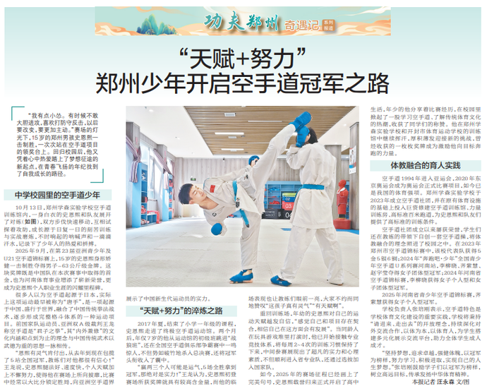“我有点小怂。有时候不敢大胆进攻,喜欢打防守反击,以后要改变,要更加主动。”赛场的灯光下,15岁的郑州男孩史恩熙一击制胜,一次次站在空手道项目的领奖台上。回归校园后,他又凭着心中热爱踏上了梦想征途的新起点,在青春飞扬的年纪找到了自我成长的路径。(今日《郑州日报》5版)