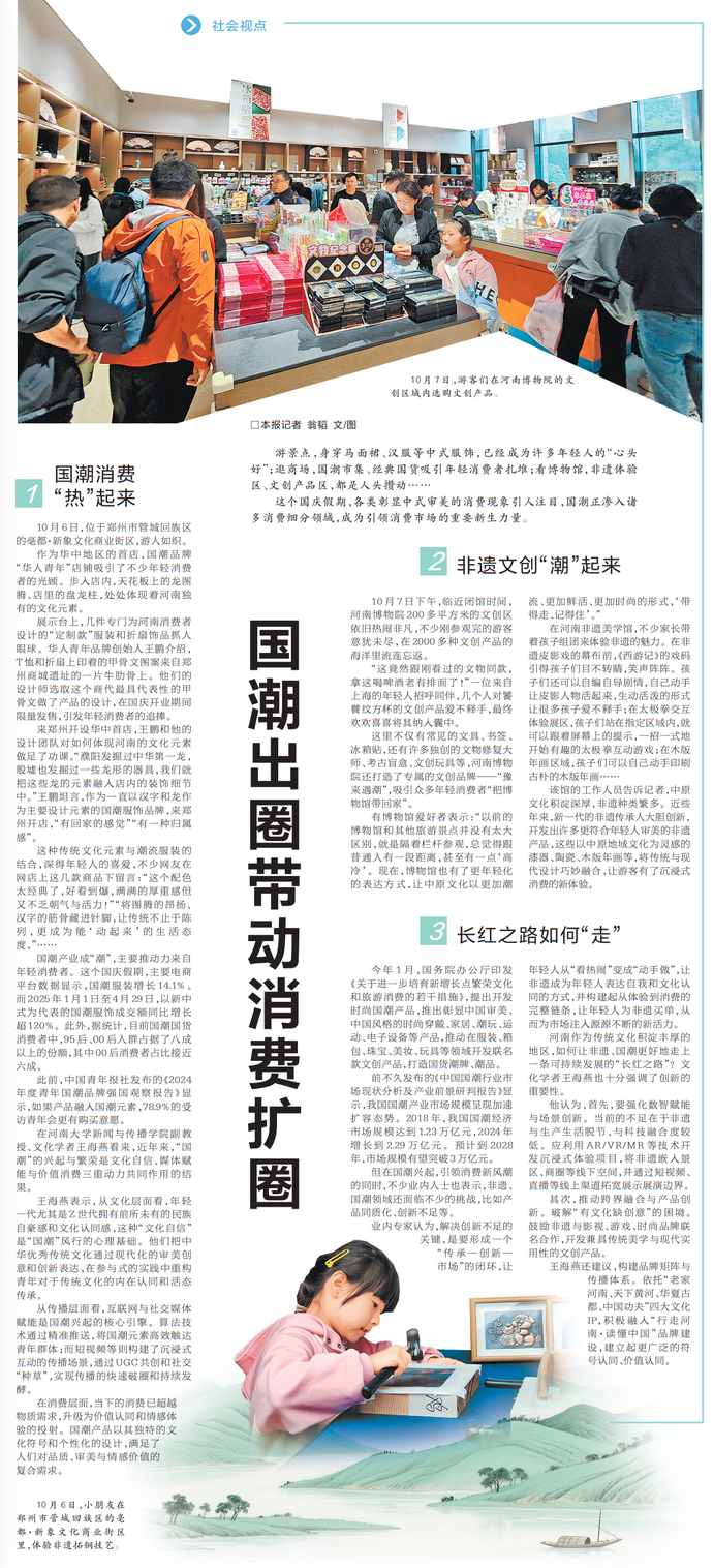 游景点,身穿马面裙、汉服等中式服饰,已经成为许多年轻人的“心头好”;逛商场,国潮市集、经典国货吸引年轻消费者扎堆;看博物馆,非遗体验区、文创产品区,都是人头攒动……(今日《河南日报》24版)